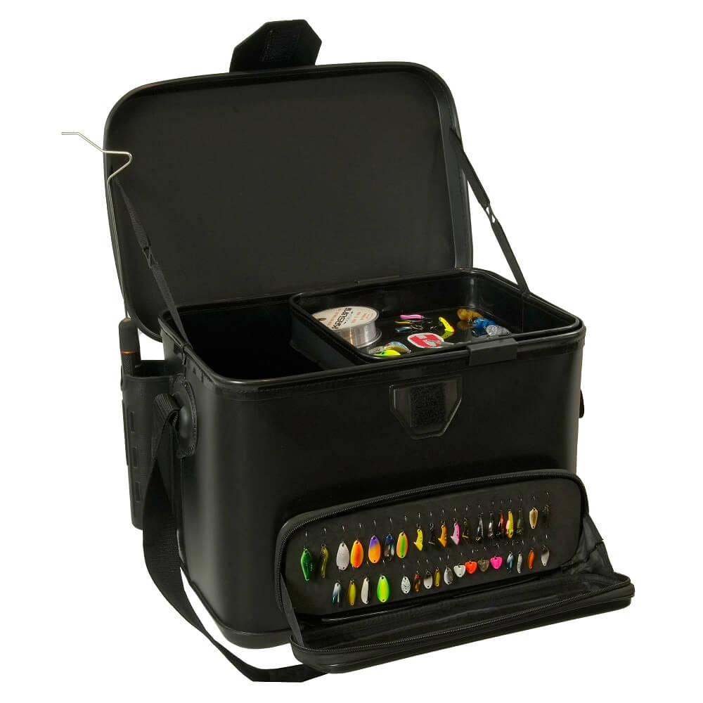 La borsa è dotata di una tasca frontale porta spoon, ideale per gli appassionati di spinning e trout area, e di una scatola scorrevole porta accessori da 24 x 24 cm, perfetta per riporre girelle, ami, piombini e piccoli attrezzi. A completare la dotazione troviamo 1 porta pinza facilmente accessibile e 2 portacanne integrati, che rendono il movimento lungo le sponde o il posizionamento in postazione estremamente comodo e veloce.