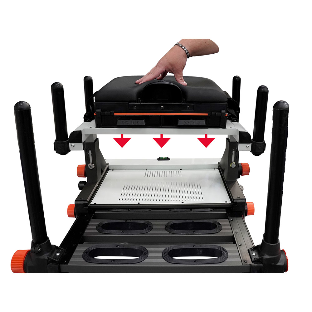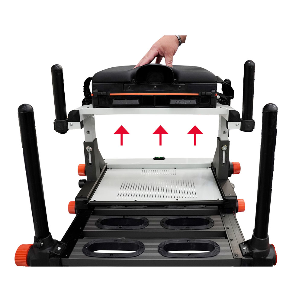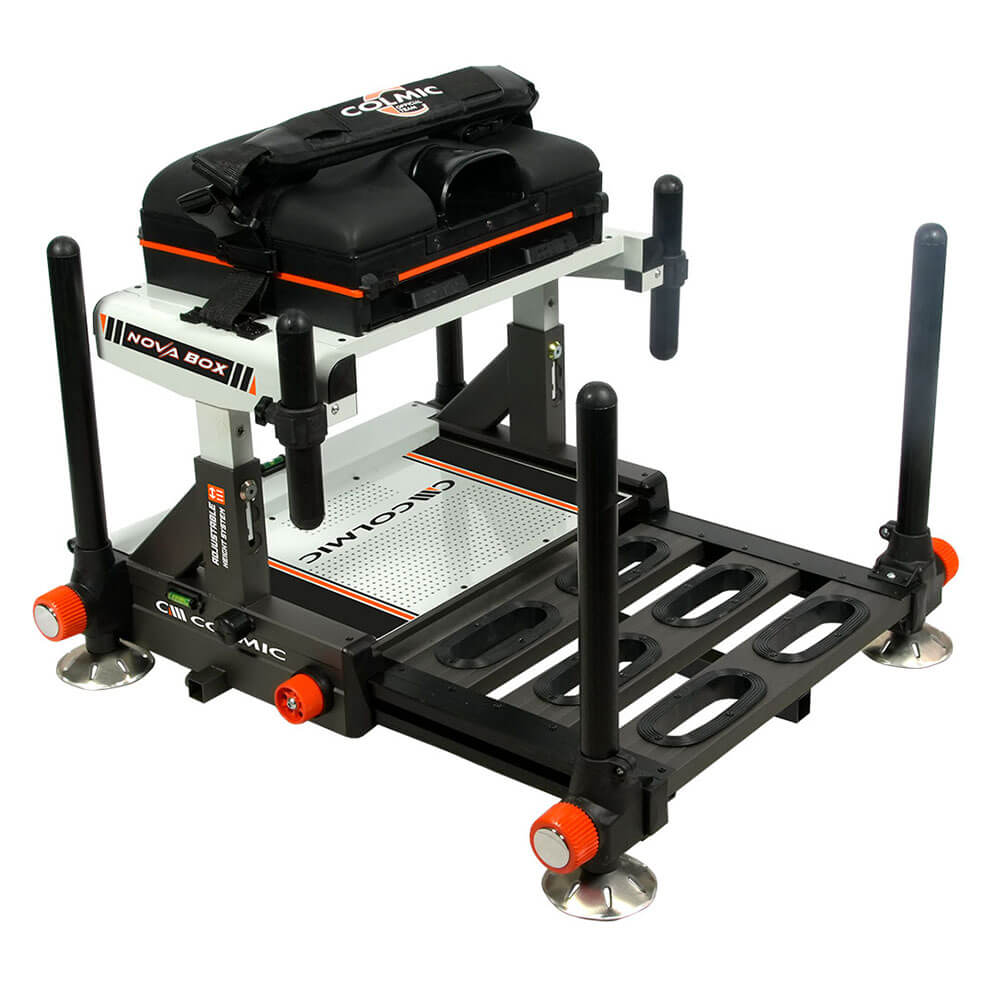 Paniere Colmic NOVA BOX con regolazione in altezza su 3 livelli (+6,5 cm), pomelli oversize, pinze rinforzate, cassetti anteriori integrati, fondo traforato, tre livelle e seduta ergonomica in foam. Compatibile con tutti gli standard Colmic.
