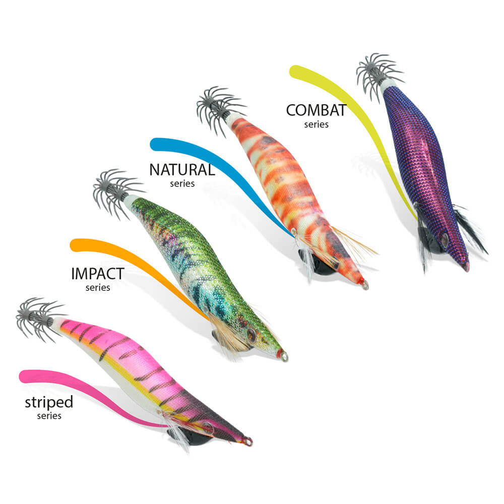 - Combact – Colori contrastati e aggressivi per attirare calamari attivi o in condizioni di luce ridotta.